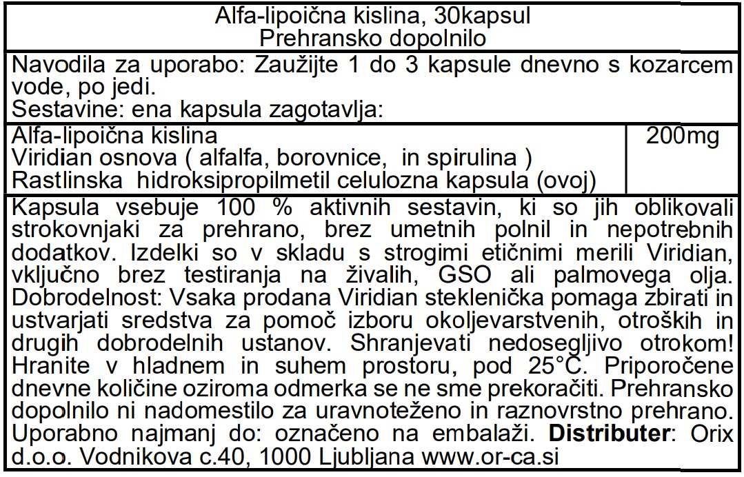 Alfa-lipoična kislina je naravno prisotna v telesu in vsaki celic. Kapsule so del Viridian Nutrition vrste prehranskih dopolnil in negovalnih izdelkov, ki delujejo v prid čistosti, okolja in dobrodelnosti.