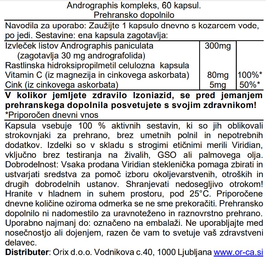 Tale kompleks sem enkrat kupila čisto slučajno. Pa je nekaj časa stal v omari. Potem pa me je popadel prehlad z groznimi bolečinami v grlu in zamašenim nosom. Ko sem se spomnila, da imam v omari Andrographis sem ga 3 dni jemala po navodilih in dejansko me je že po prvih dveh kapsulah nehalo bolet grlo. Neverjetno. Dala sem ga tudi mojemu očetu, ki ima izredne težave s hripavostjo in se težko odkašlja pa je rekel, da je to edina stvar, ki mu dejansko pomaga. Toplo priporočam, da imate v domači lekarni.